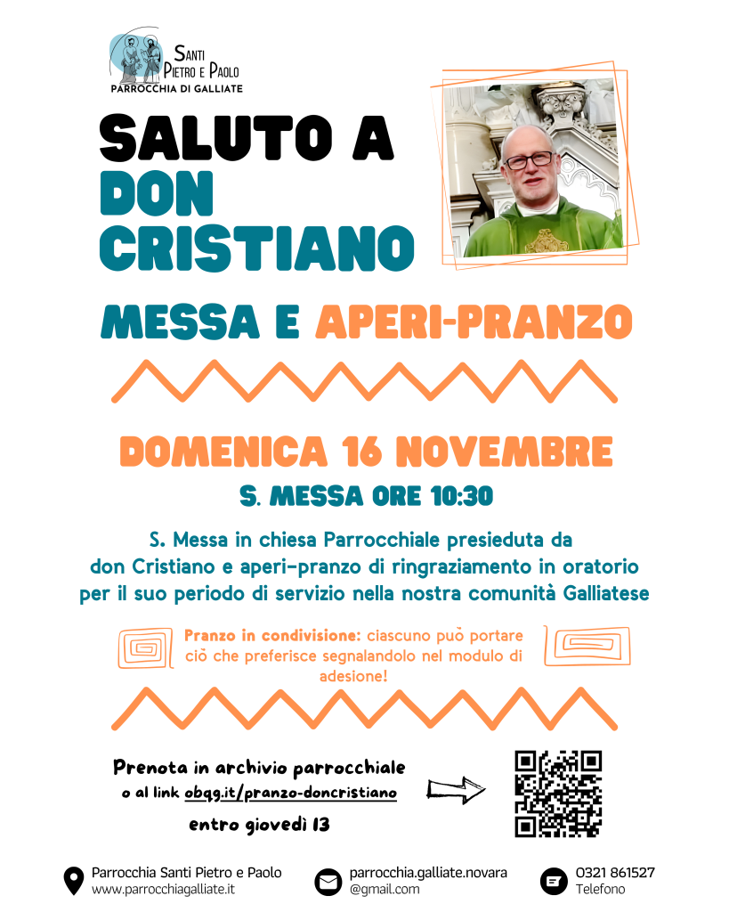 Arrivato a Galliate neanche due anni fa, don Cristiano ha saputo farsi conoscere e volere bene per la sua presenza semplice, discreta e profonda. Con il suo stile di prete vicino e concreto, ha accompagnato la vita della parrocchia, delle famiglie e dei giovani, condividendo con noi la gioia del Vangelo e la bellezza di camminare insieme come comunità.