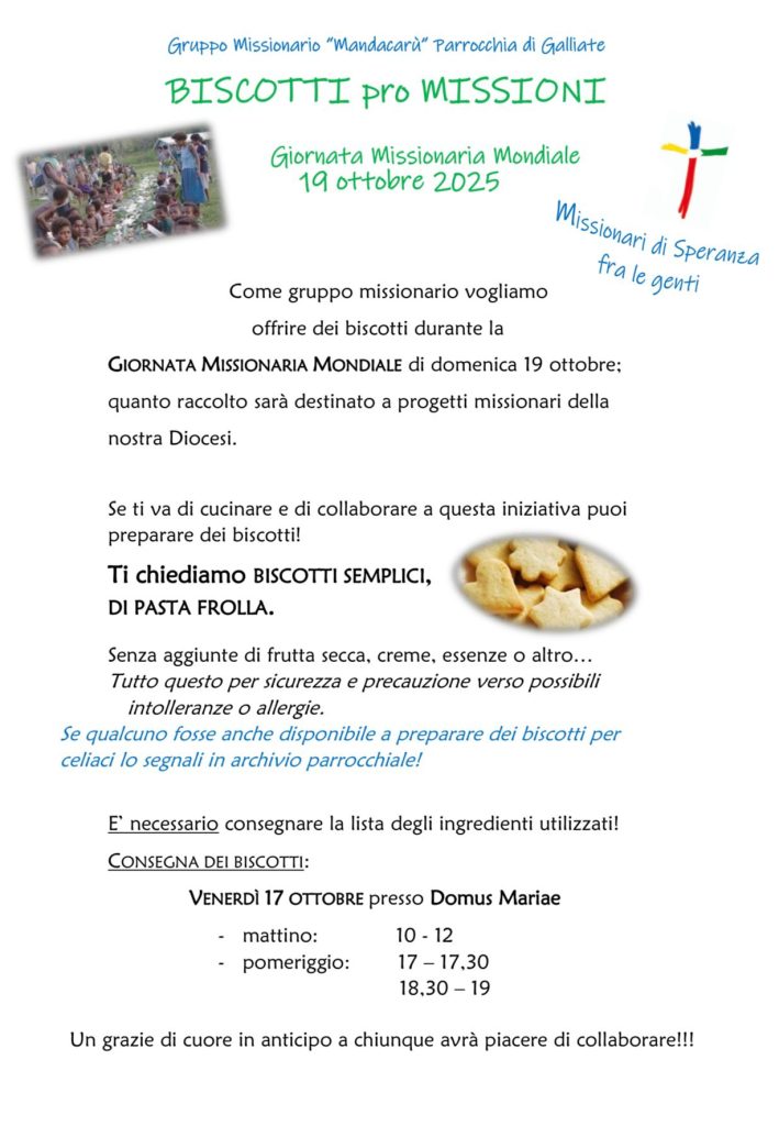 In occasione della Giornata Missionaria Mondiale, domenica 19 ottobre, il Gruppo Missionario della Parrocchia di Galliate sarà presente fuori dalla chiesa con la tradizionale vendita dei biscotti pro missioni.