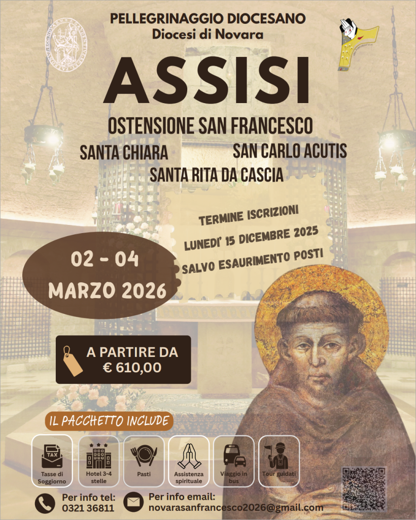 La Diocesi di Novara propone a tutte le parrocchie un pellegrinaggio di tre giorni ad Assisi e Cascia, dal 2 al 4 marzo 2026, in occasione dell’VIII Centenario della morte di San Francesco. Un evento particolarmente significativo, arricchito dalla possibilità di partecipare all’ostensione straordinaria delle reliquie di San Francesco, concessa per questo Anno Francescano.