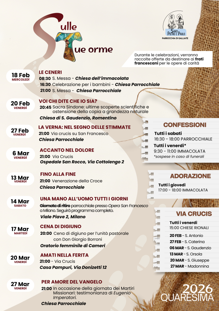 Durante queste settimane vivremo insieme diversi momenti di preghiera e riflessione: celebrazioni, Via Crucis, ritiri, adorazioni, incontri e occasioni comunitarie. Un percorso pensato per coinvolgere tutti, giovani e adulti. Invitiamo ciascuno a partecipare con cuore aperto, lasciandosi provocare e accompagnare da questo tempo di grazia.
