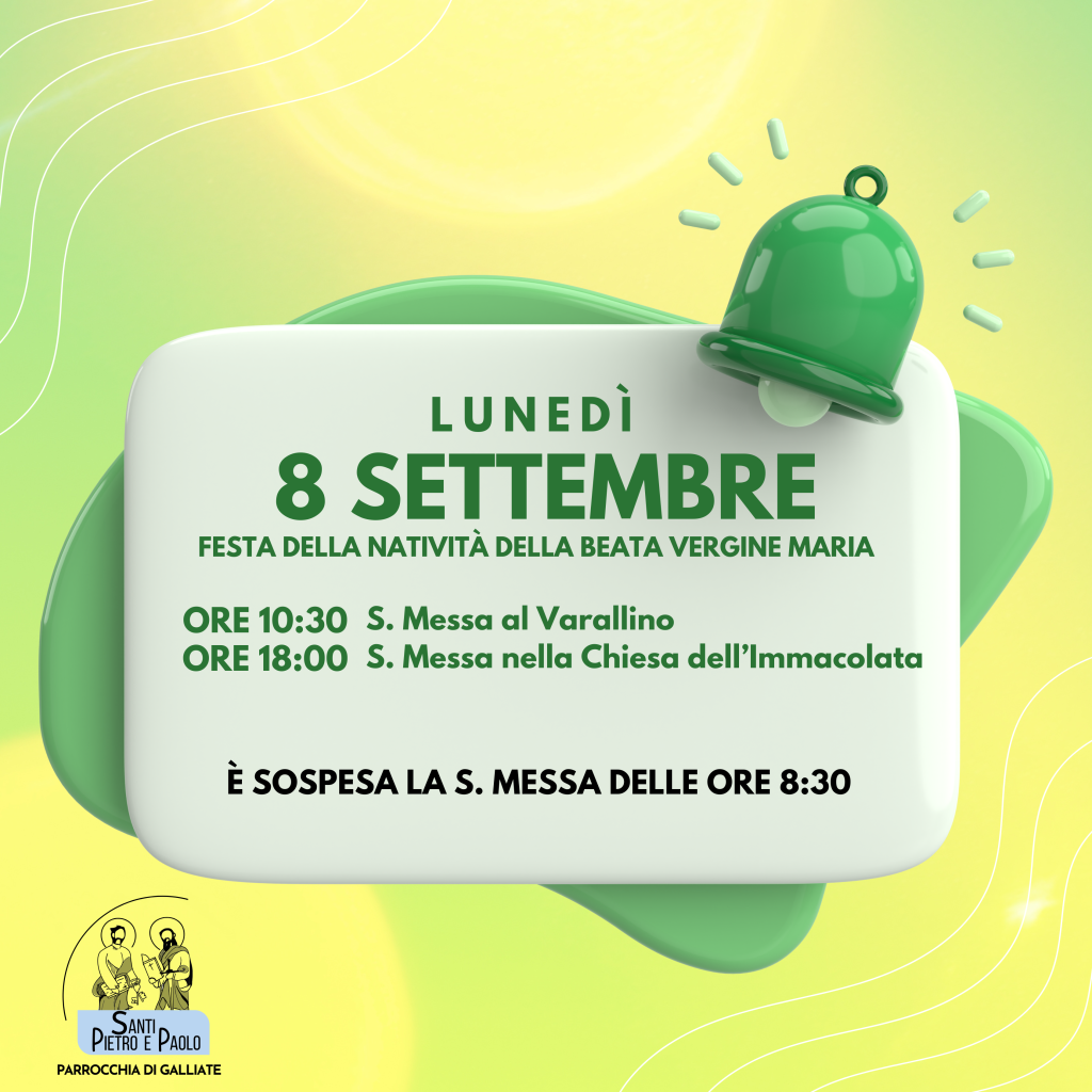 Lunedì 8 settembre, in occasione della Festa della Natività della Beata Vergine Maria, gli orari delle celebrazioni subiranno una variazione rispetto al consueto.
